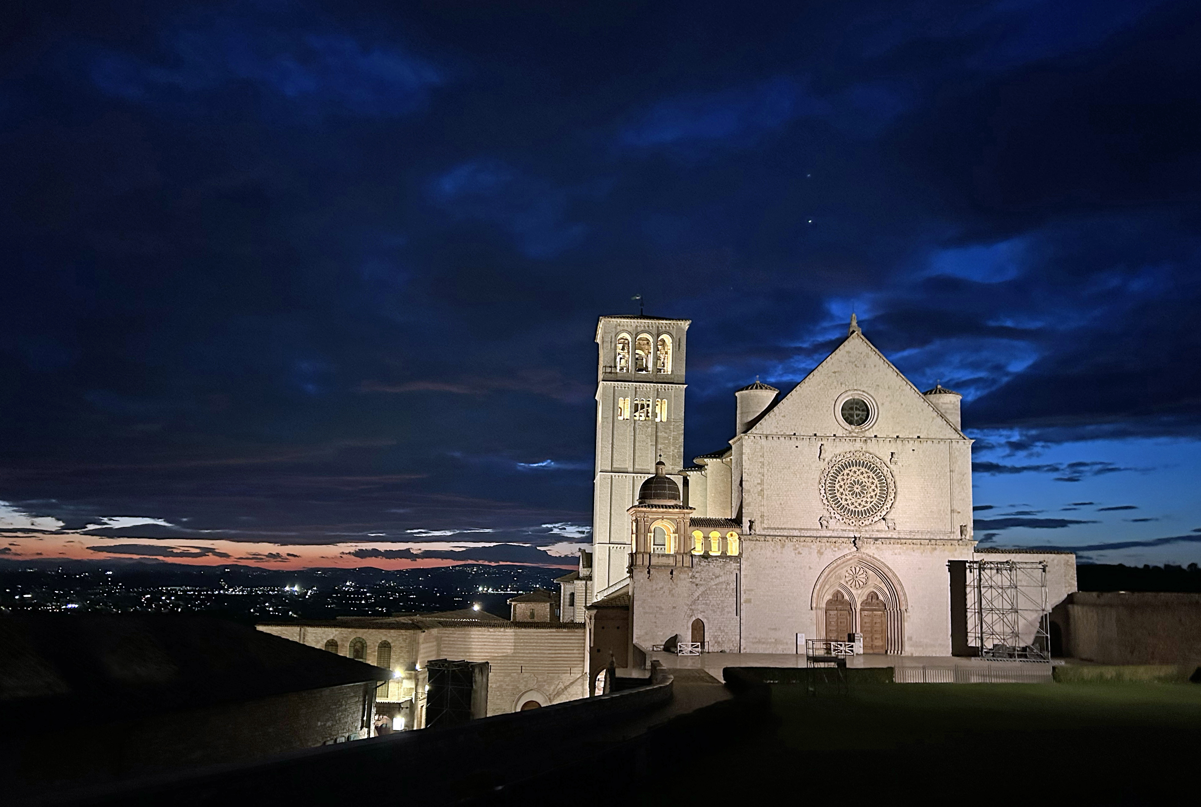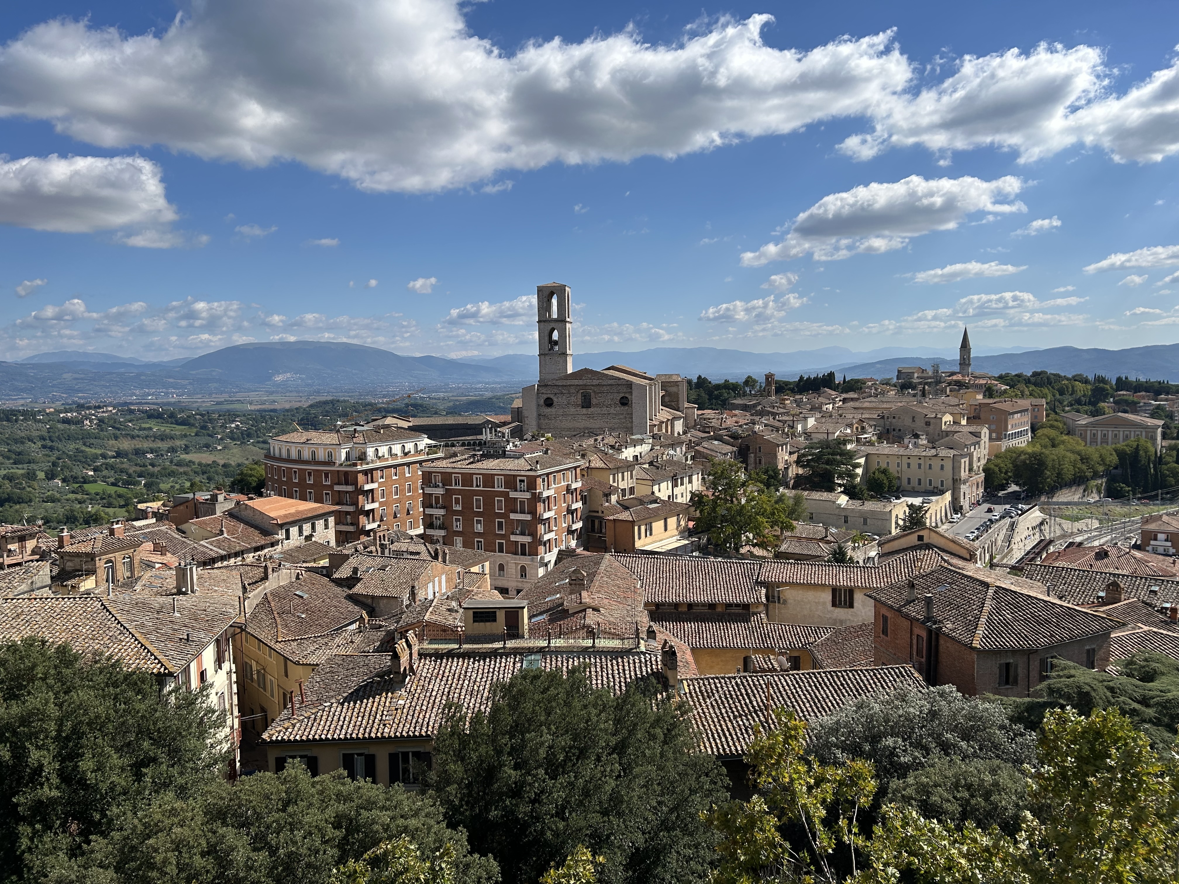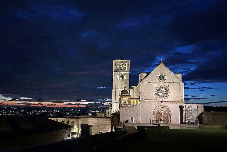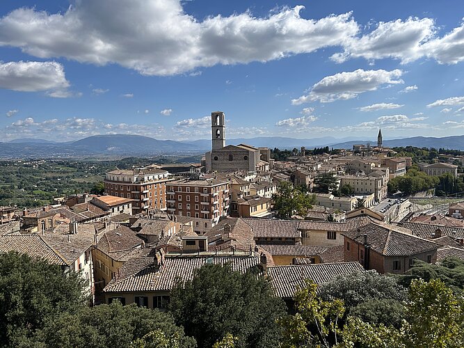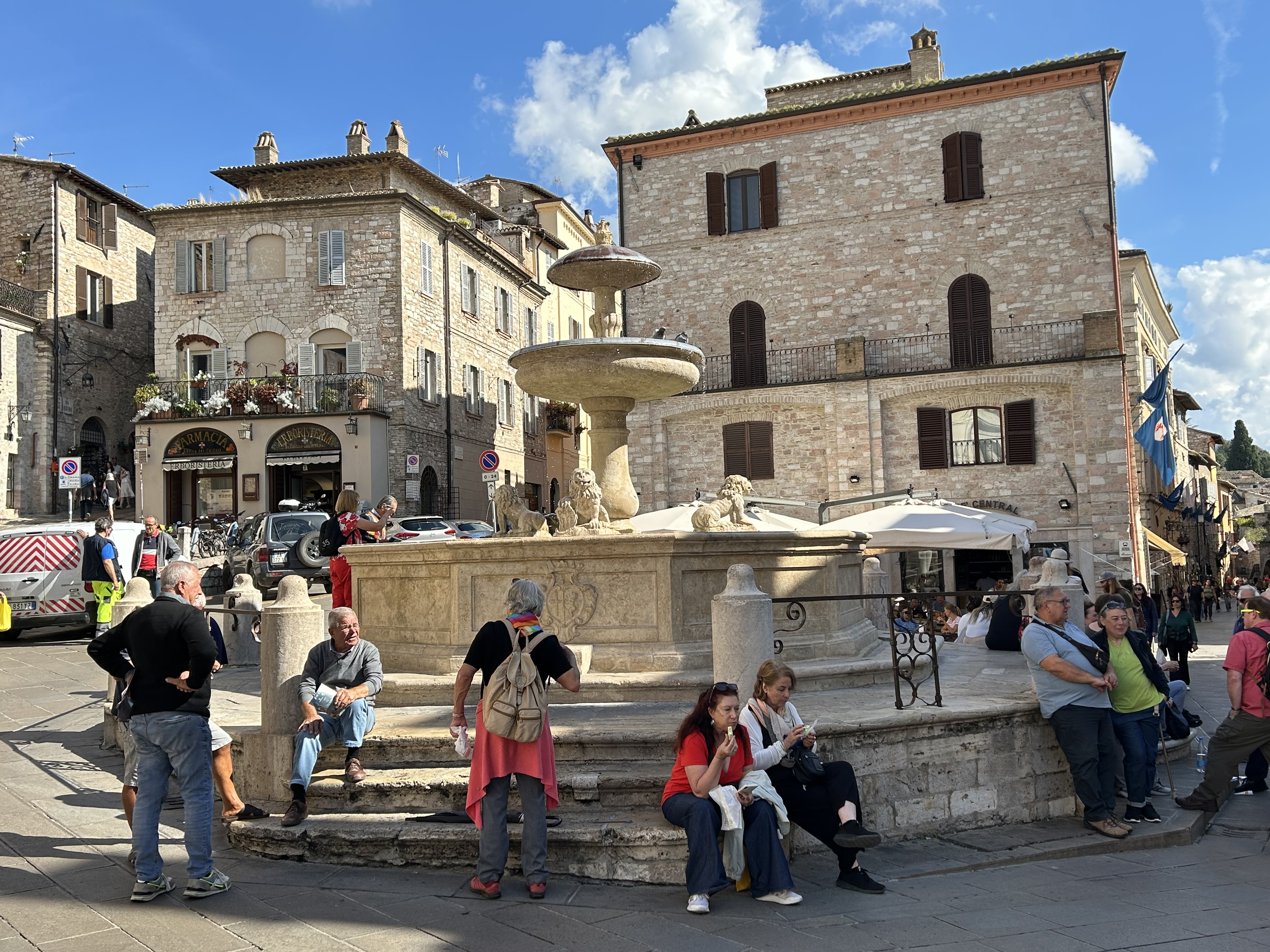 Einen ganzen Tag plante die AMG-Gruppe außerdem für eine Wanderung unter dem Zeichen des (griechisch-hebräischen) „Tau“, durch die schöne umbrische Landschaft, auf dem Franziskusweg ein, für die Etappe zwischen Assisi und Valfabricca. (Im Kontrast zur Friedensbotschaft und Schöpfungsliebe des Franziskus, geriet die Gruppe in die letzten Ausläufer eine Wildschweinjagd. Angst sollten wir nicht haben, wohl aber Hunger, gaben uns die selbstbewussten Jäger mit auf den Weg…) Den Abschluss bildeten der Besuch der Portiuncula-Kapelle und eine Exkursion in die elegante Nachbarstadt Perugia, gegen die Franziskus einstmals kämpfte. Mit der futuristischen Minimetro und zu Fuß wurde die Stadt erkundet, aufgelockert durch kulinarischen Pausen.