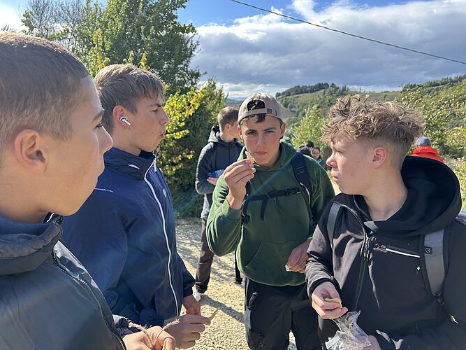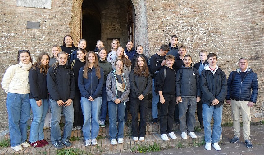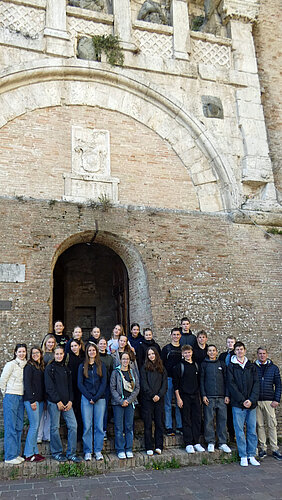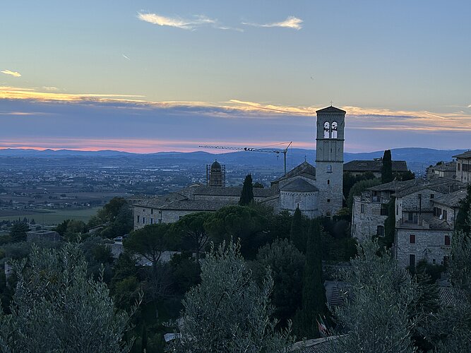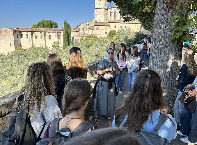 Auf den Spuren des Hl. Franziskus waren Ende September 2025 22 Schülerinnen und Schüler der Klassenstufen 10 bis 12 des Albertus-Magnus-Gymnasiums in Assisi unterwegs, begleitet wurden sie von Frau Seufert und Herrn Hagemann. In der Casa Papa Giovanni, einem kirchlichen Haus der Domgemeinde St. Rufino, waren die AMGlern gemeinsam mit gut gelaunten Pilgern aus den USA untergebracht und wurden abends mit Hingabe bekocht. Die Tage wurden mit einem Morgenimpuls zum Leben des Franziskus eröffnet, es ging u.a. um sein bewegtes Leben vom Bürgersohn zum Mönch, um den Rückzug in die Einsiedelei („Eremo“) und seine Ordensregeln nach dem Armutsideals, um seinen Umgang mit der Schöpfung und seinen Dialog mit Muslimen während der Kreuzzüge.