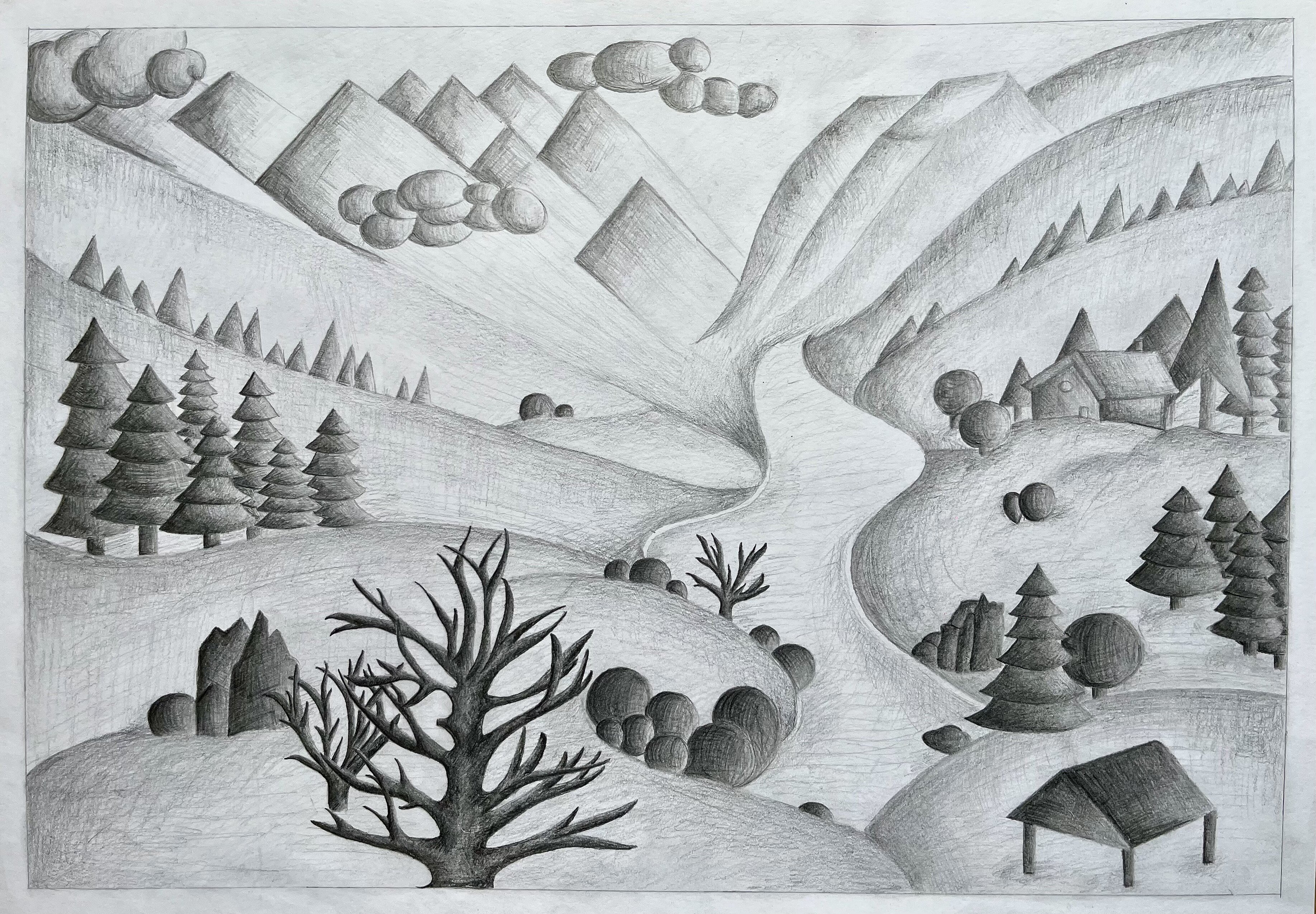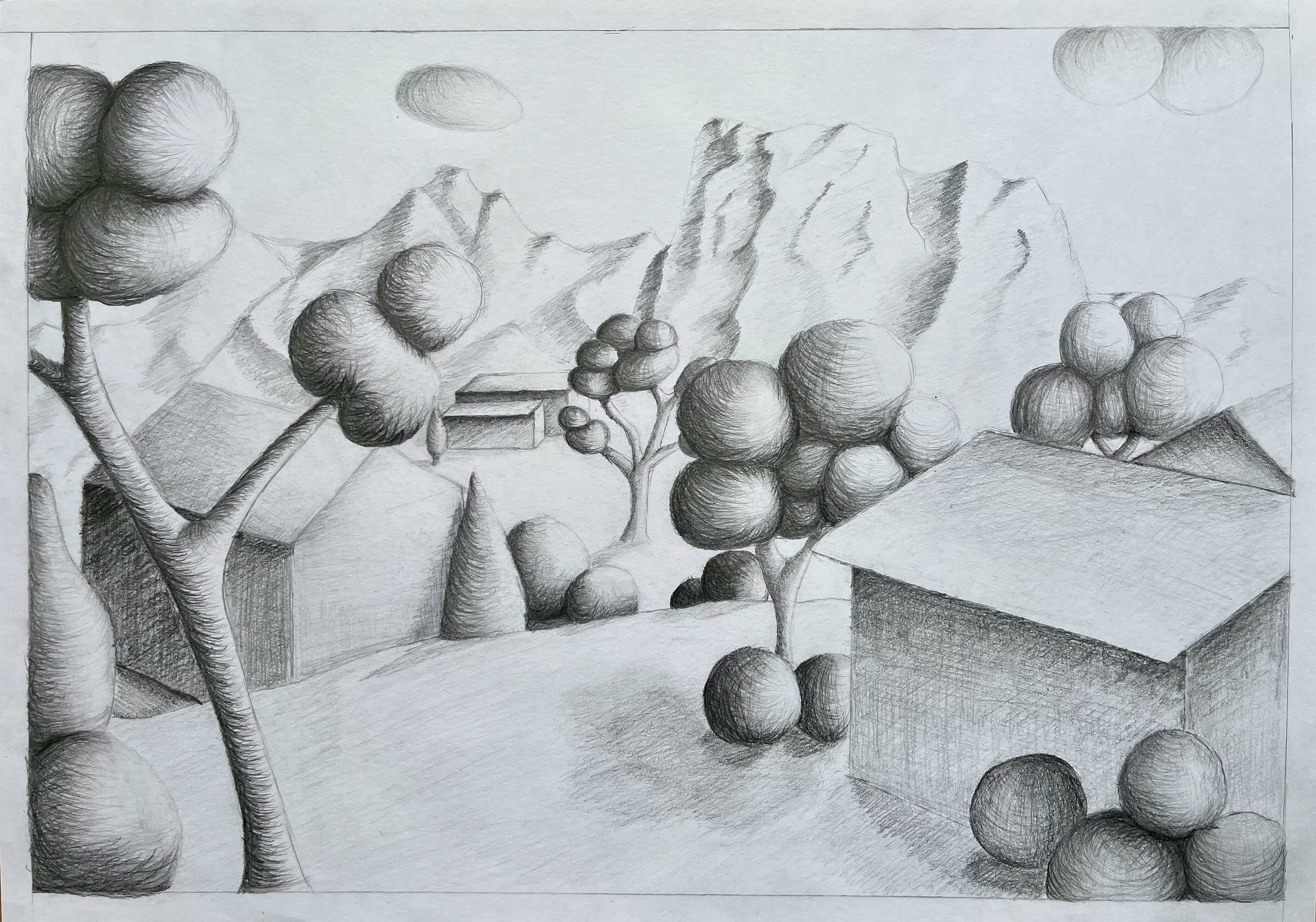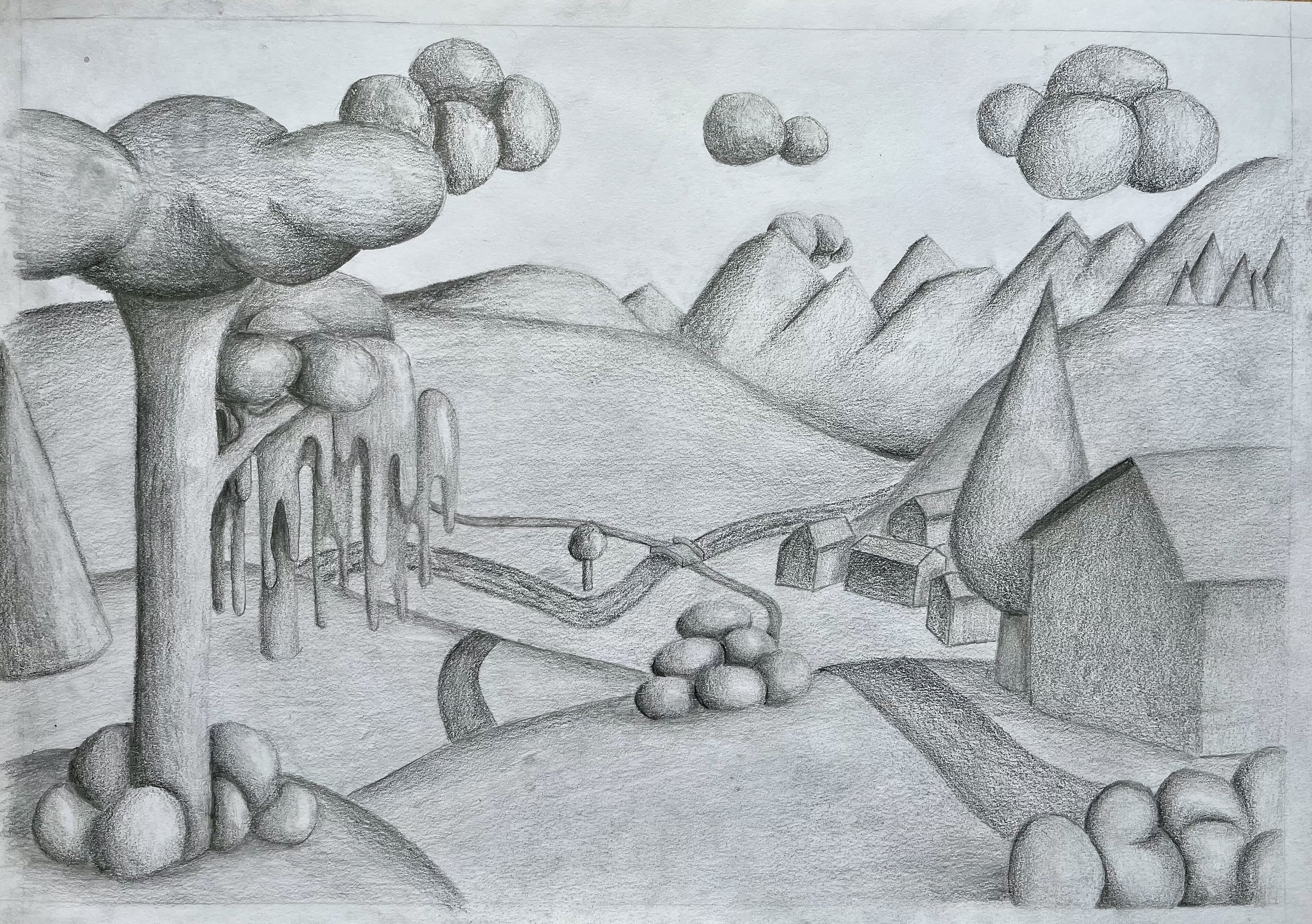 Die Landschaft in Gedanken - die Schülerinnen und Schüler aus dem Leistungsfach haben aus ihrer Vorstellung heraus Landschaften gezeichnet, in denen stilisierte Formen und räumliche Tiefe stimmungsvoll zusammen wirken.