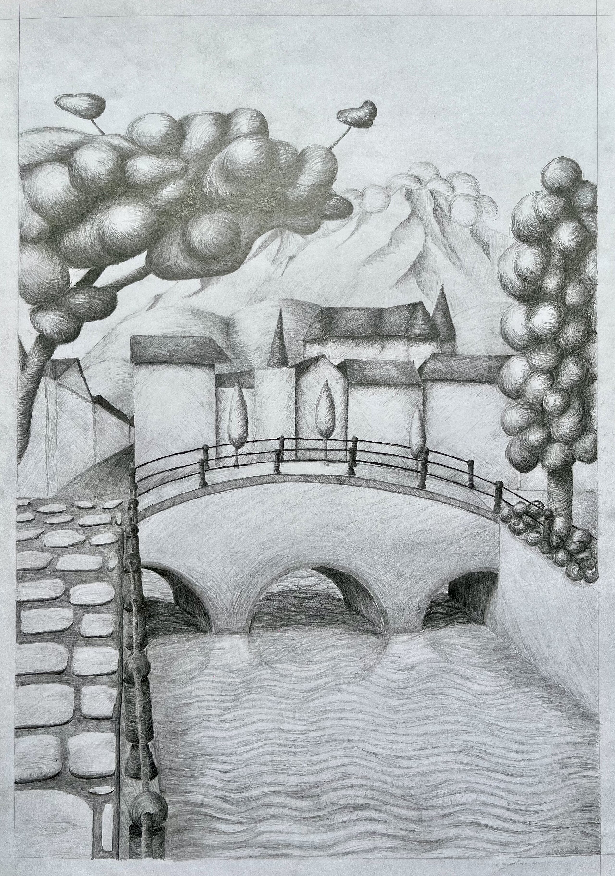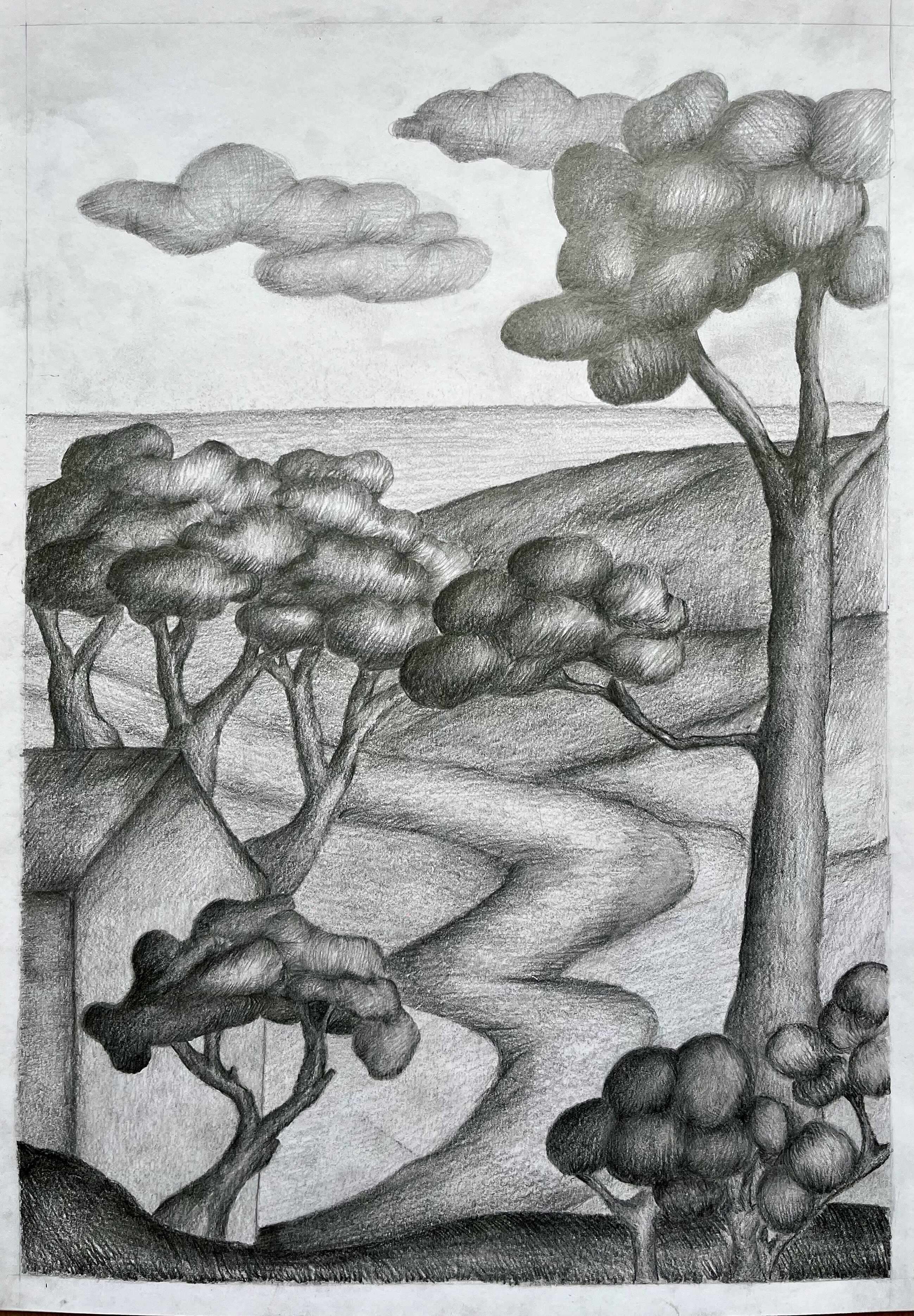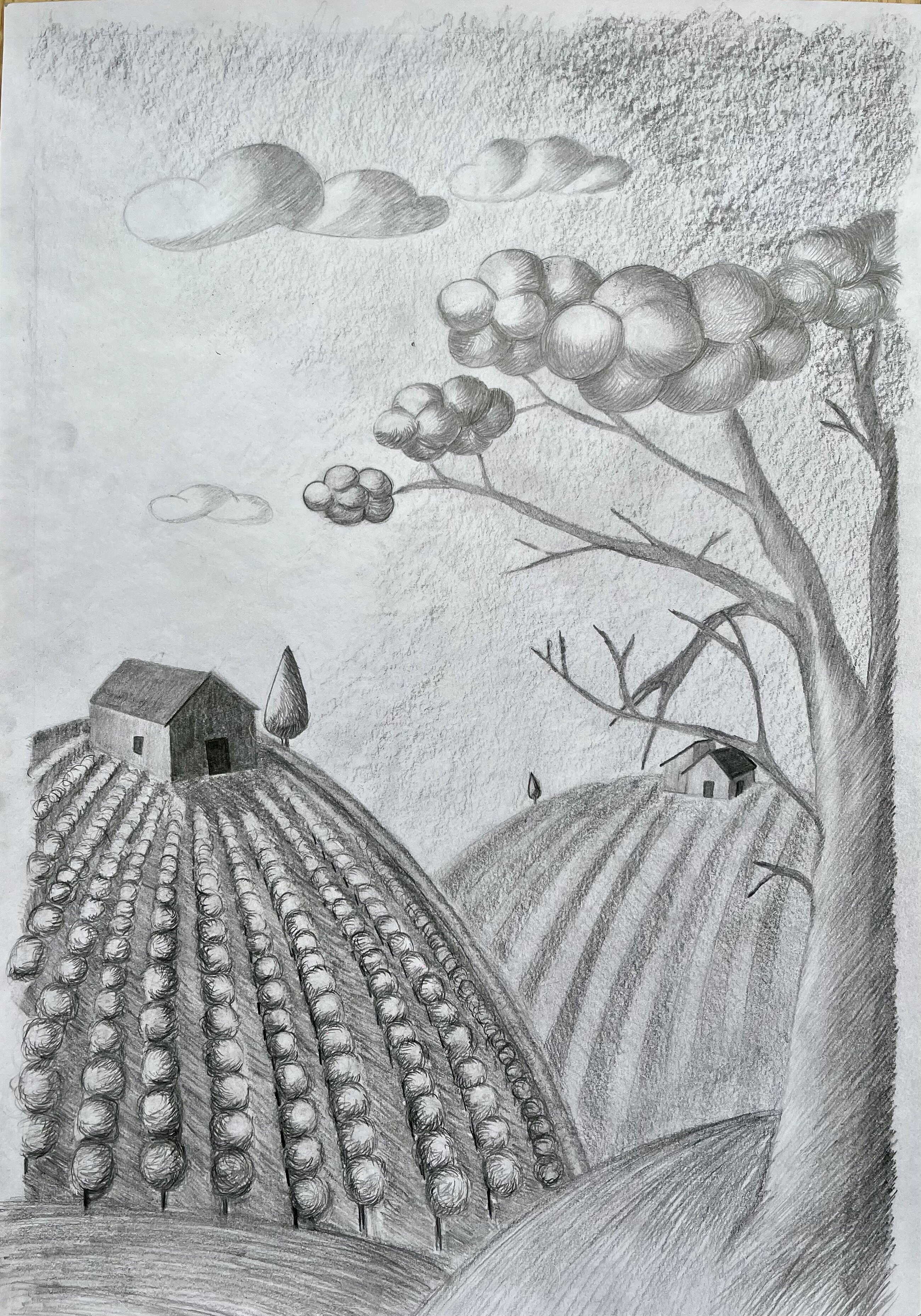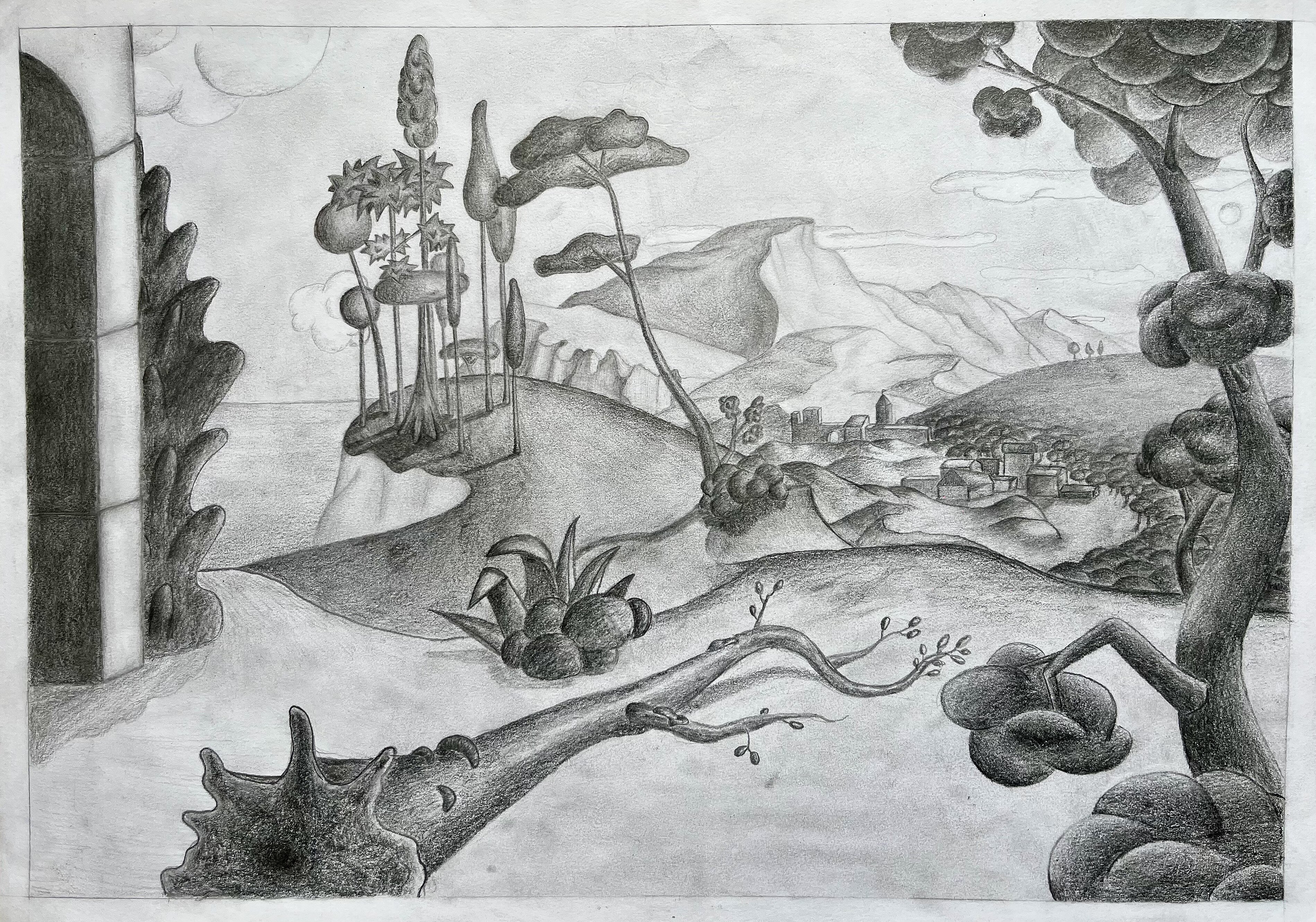 Die Landschaft in Gedanken - die Schülerinnen und Schüler aus dem Leistungsfach haben aus ihrer Vorstellung heraus Landschaften gezeichnet, in denen stilisierte Formen und räumliche Tiefe stimmungsvoll zusammen wirken.