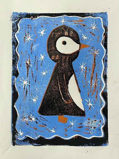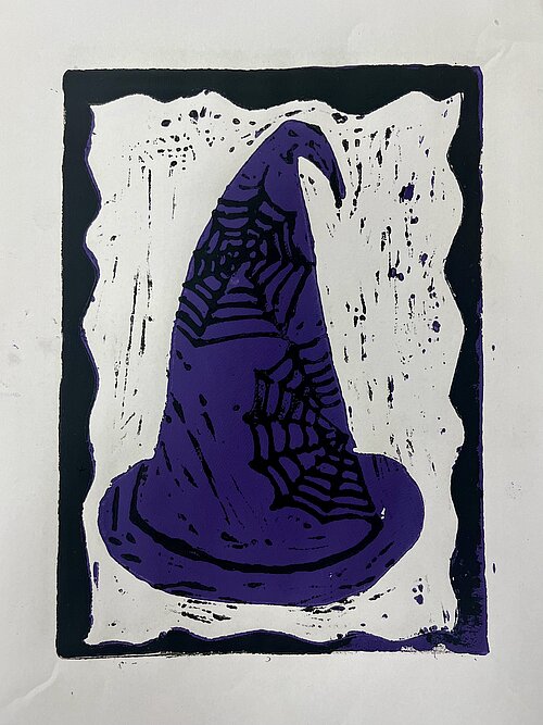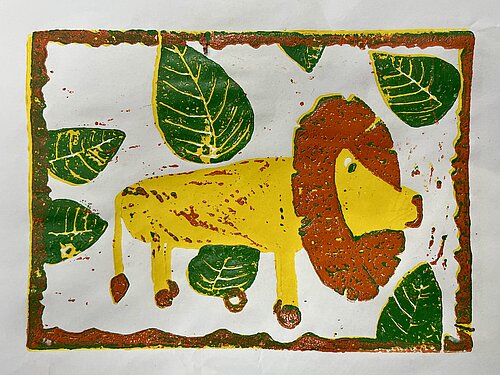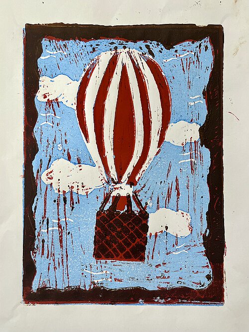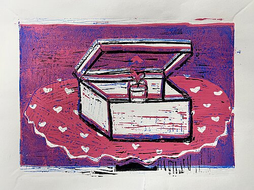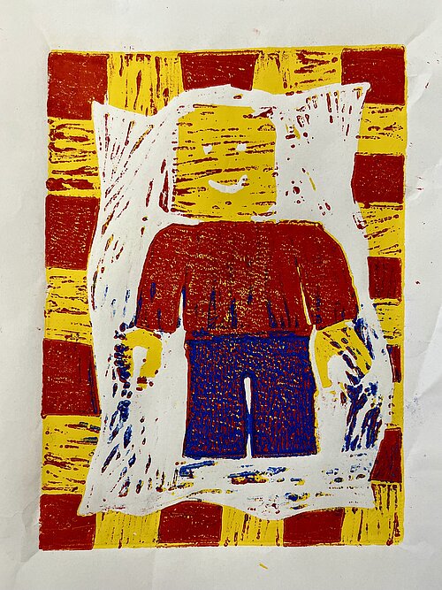 Spielzeug - nachdem sie im Unterricht die Kunst von Andy Warhol und dessen farbenfrohe Siebdrucke kennengelernt hatte, wurde die Klasse 7a selbst druckgrafisch tätig. Angeregt von Warhols Bildern für Kinder sind in der Technik der sogenannten verlorenen Platte mehrfarbige Linolschnitte zum Thema Spielzeug entstanden. Manche Motive lassen schon an den Fasching denken und auch so manche winterliche Bilder sind dabei.