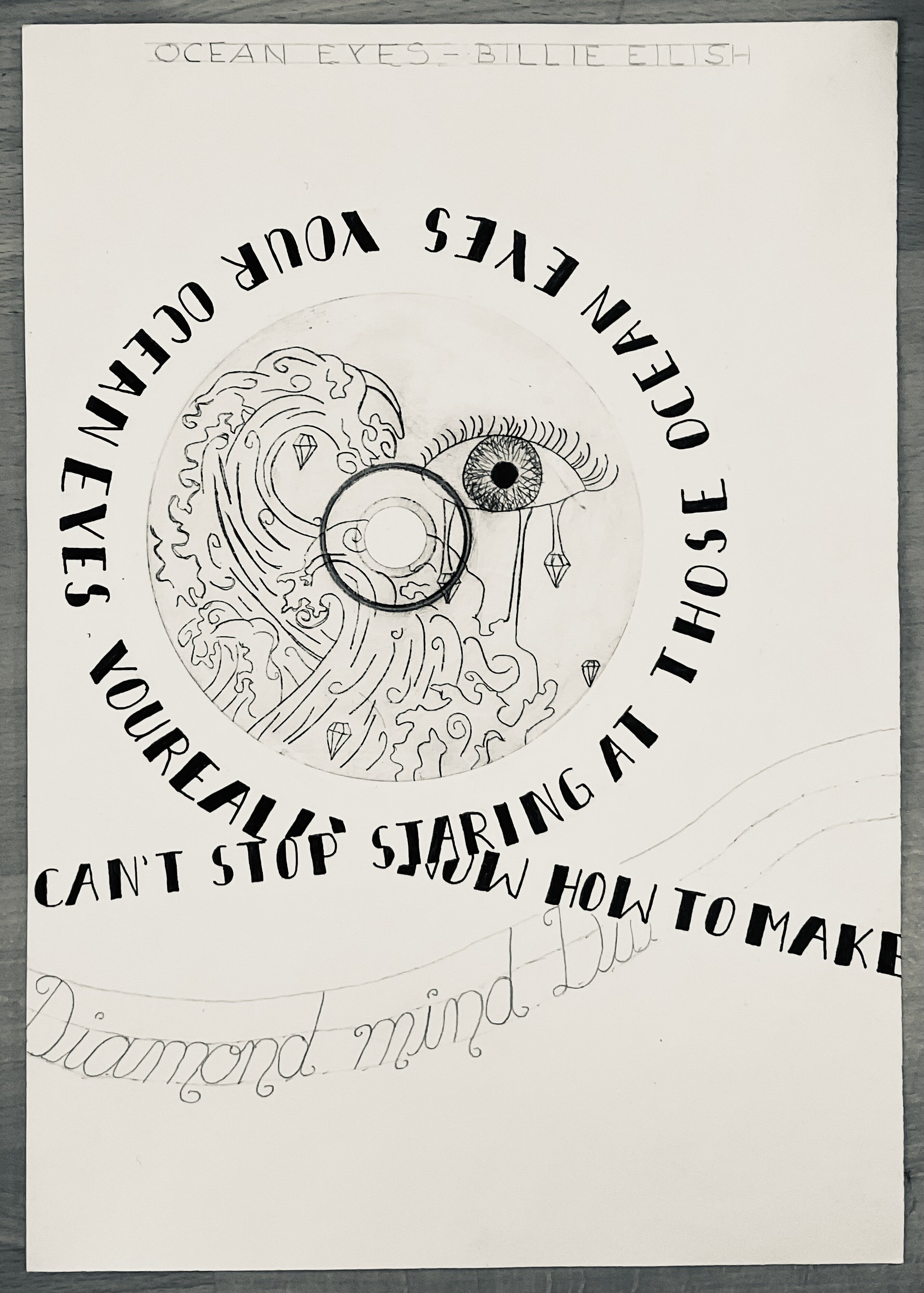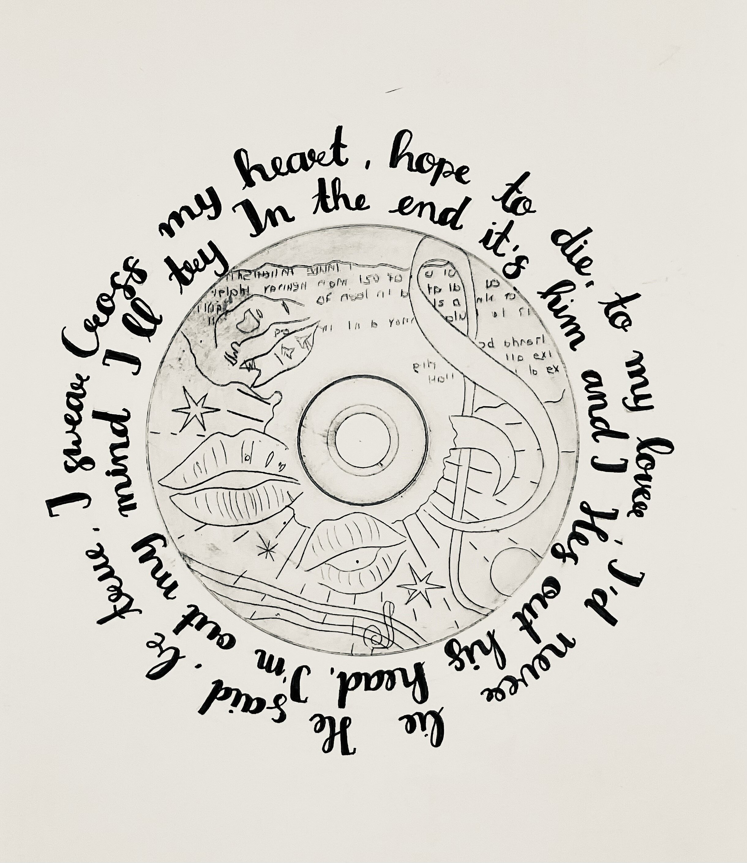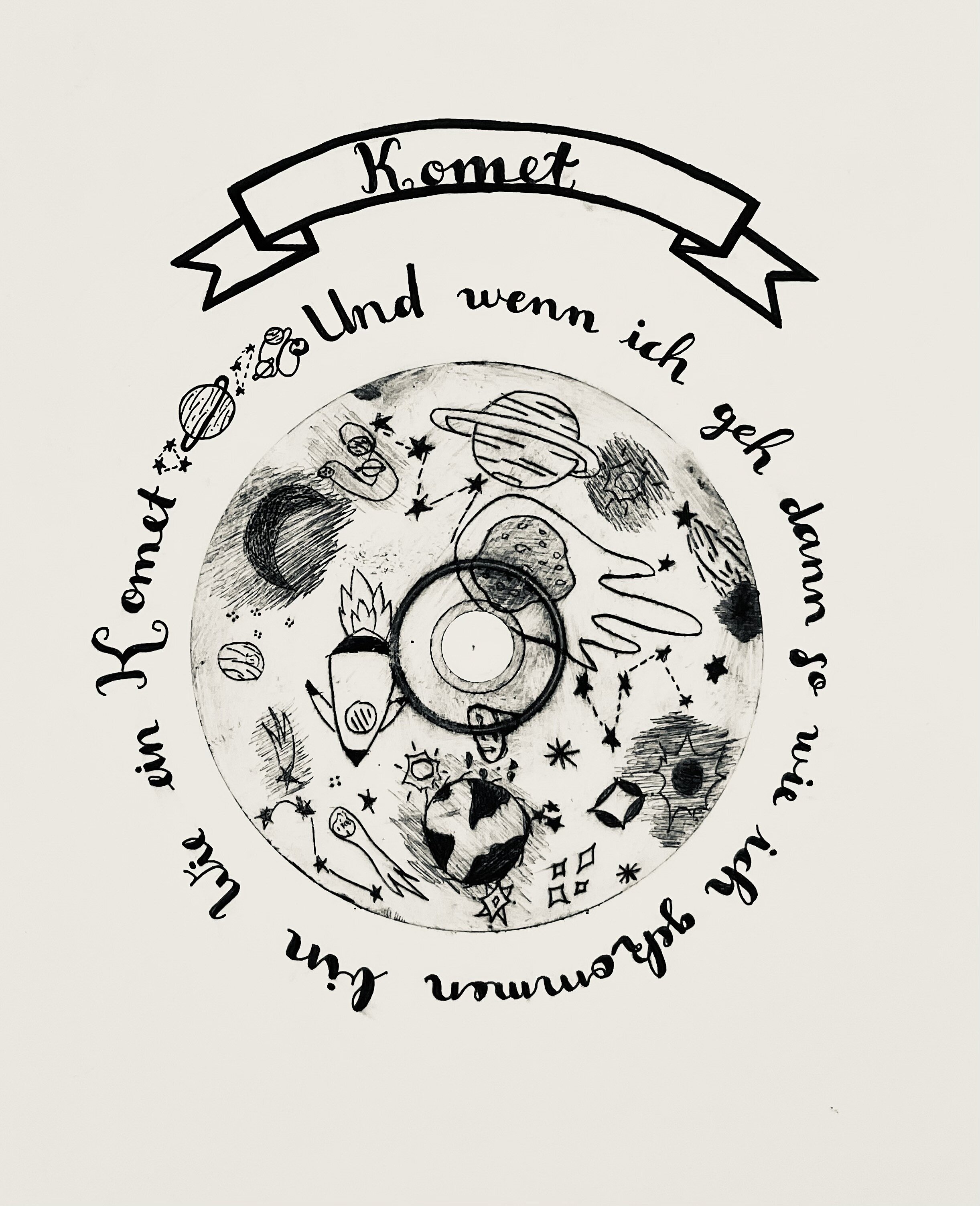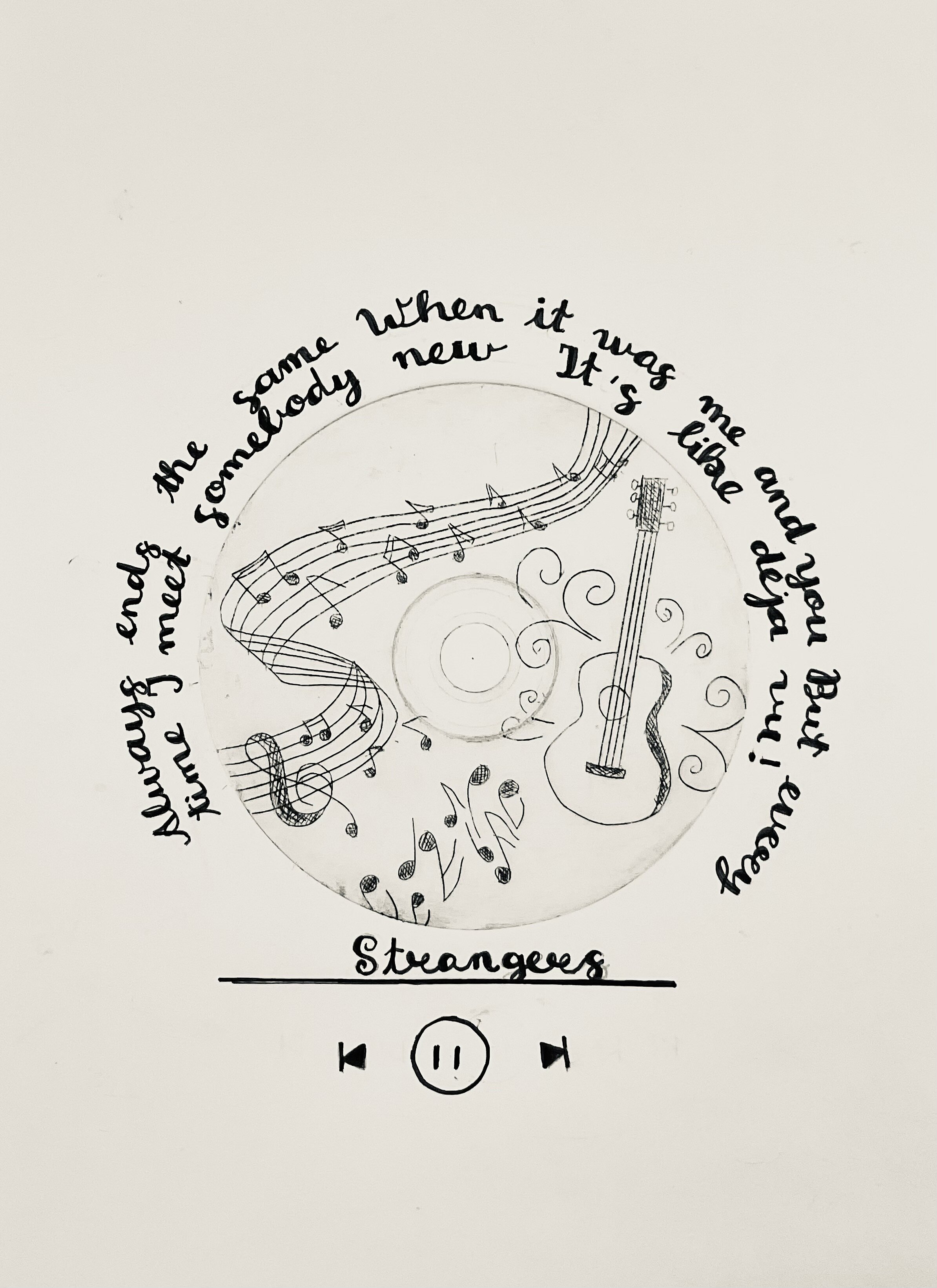 Die Schülerinnen und Schüler der Klasse 8b haben im Kunstunterricht zu ihrem jeweiligen Lieblingssong eine Kaltnadelradierung gestaltet. Dafür ritzten sie ihr Motiv sorgfältig in eine alte CD und fertigten anschließend im Tiefdruckverfahren Drucke an. Ergänzend entwarfen sie mit ausgewählten Textteilen ihres Liedes eine individuelle Schriftgestaltung, die den Druck umrahmt. So entstanden persönliche Werke, in denen Musik und Gestaltung kreativ miteinander verbunden sind.