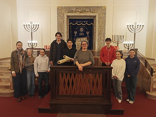 In der Synagoge erhielten die HISTORIES eine ausführliche Führung, die sowohl die bewegte Geschichte des Gebäudes als auch seine religiöse Bedeutung in den Blick nahm. Die Synagoge wurde in der Reichspogromnacht 1938 in Brand gesetzt und zerstört, später jedoch wieder aufgebaut. Neben diesen historischen Hintergründen lernten die Schülerinnen und Schüler auch den Gebets- und Versammlungsraum als heiligen Ort kennen. Besonders eindrucksvoll war dabei der sehr persönliche Zugang, den Frau Goldmann eröffnete: Sie berichtete aus ihrem eigenen Leben und darüber, wie sie heute Judentum lebt. Dadurch wurde Geschichte nicht nur vermittelt, sondern unmittelbar erfahrbar.
