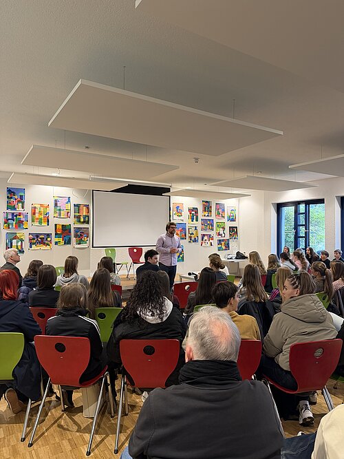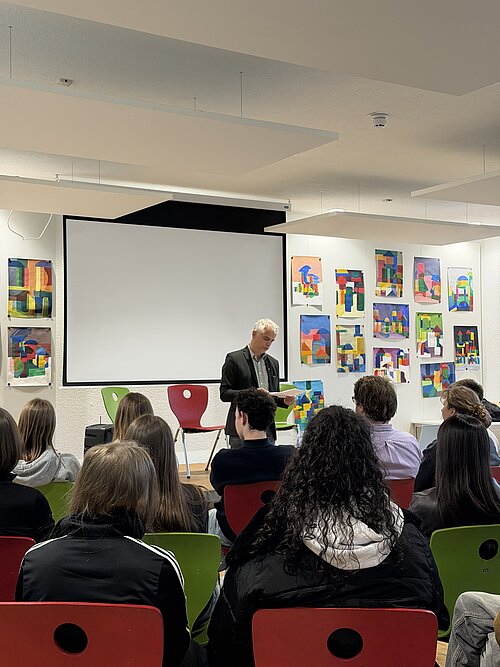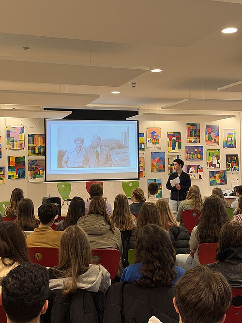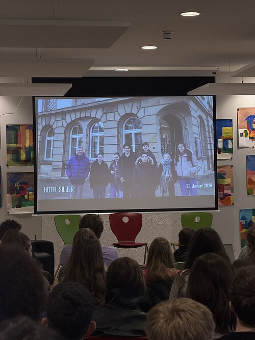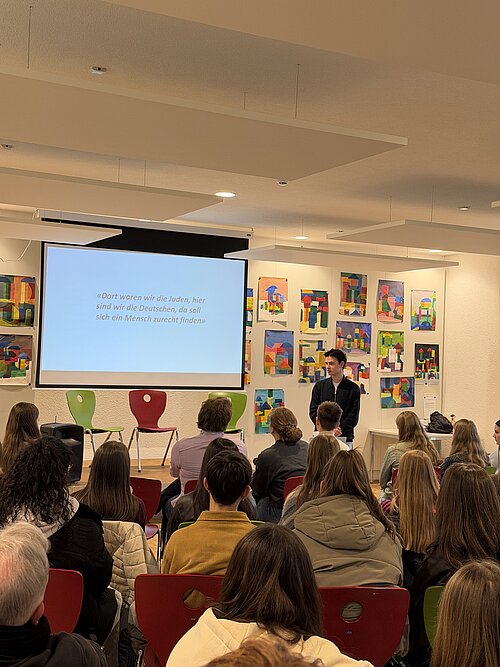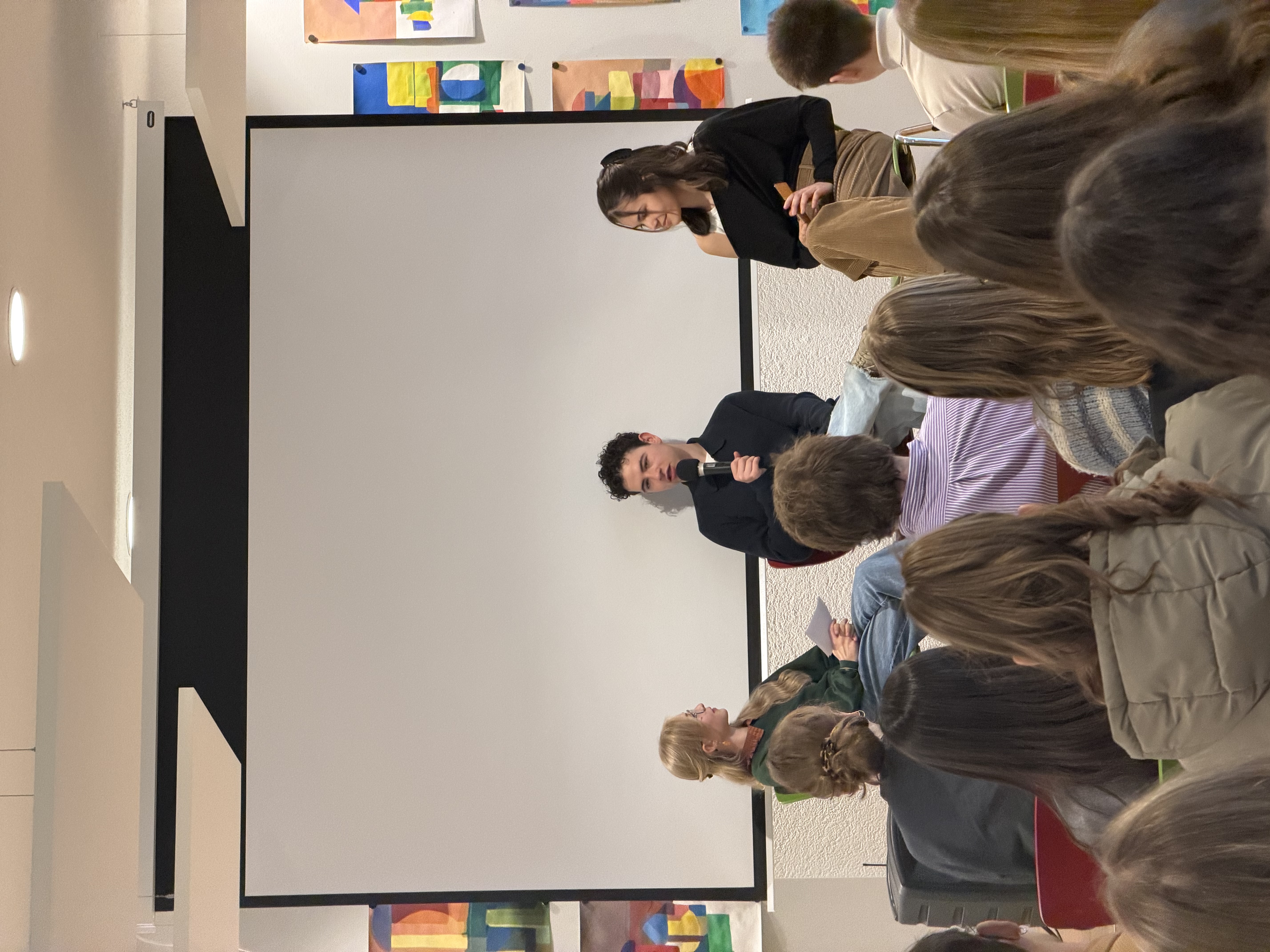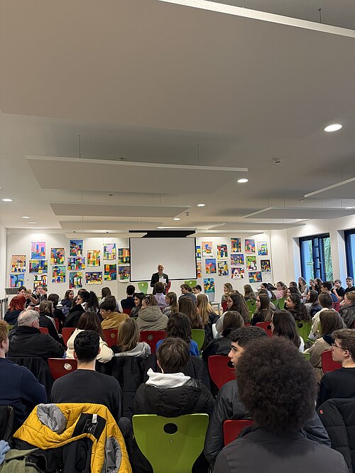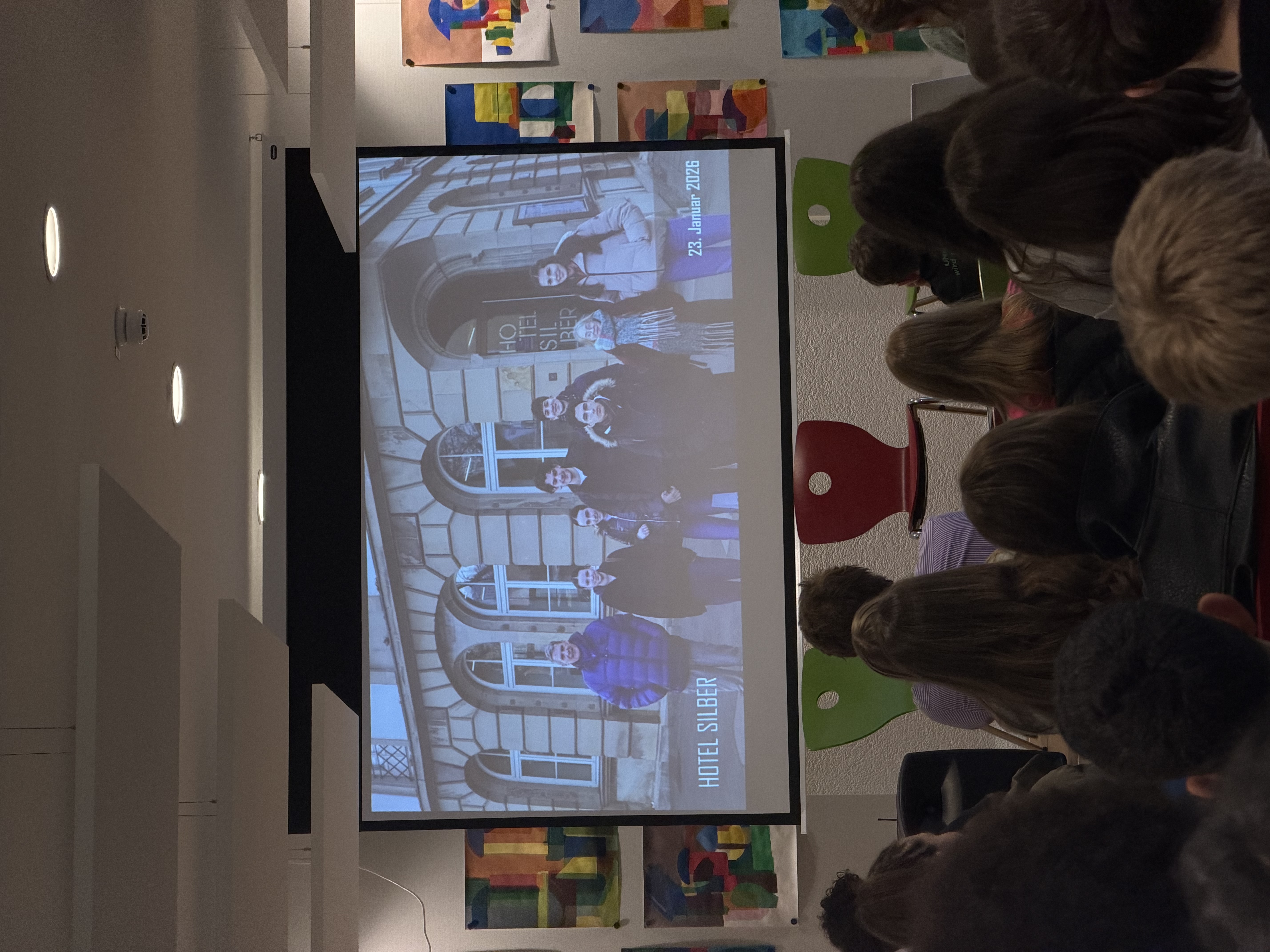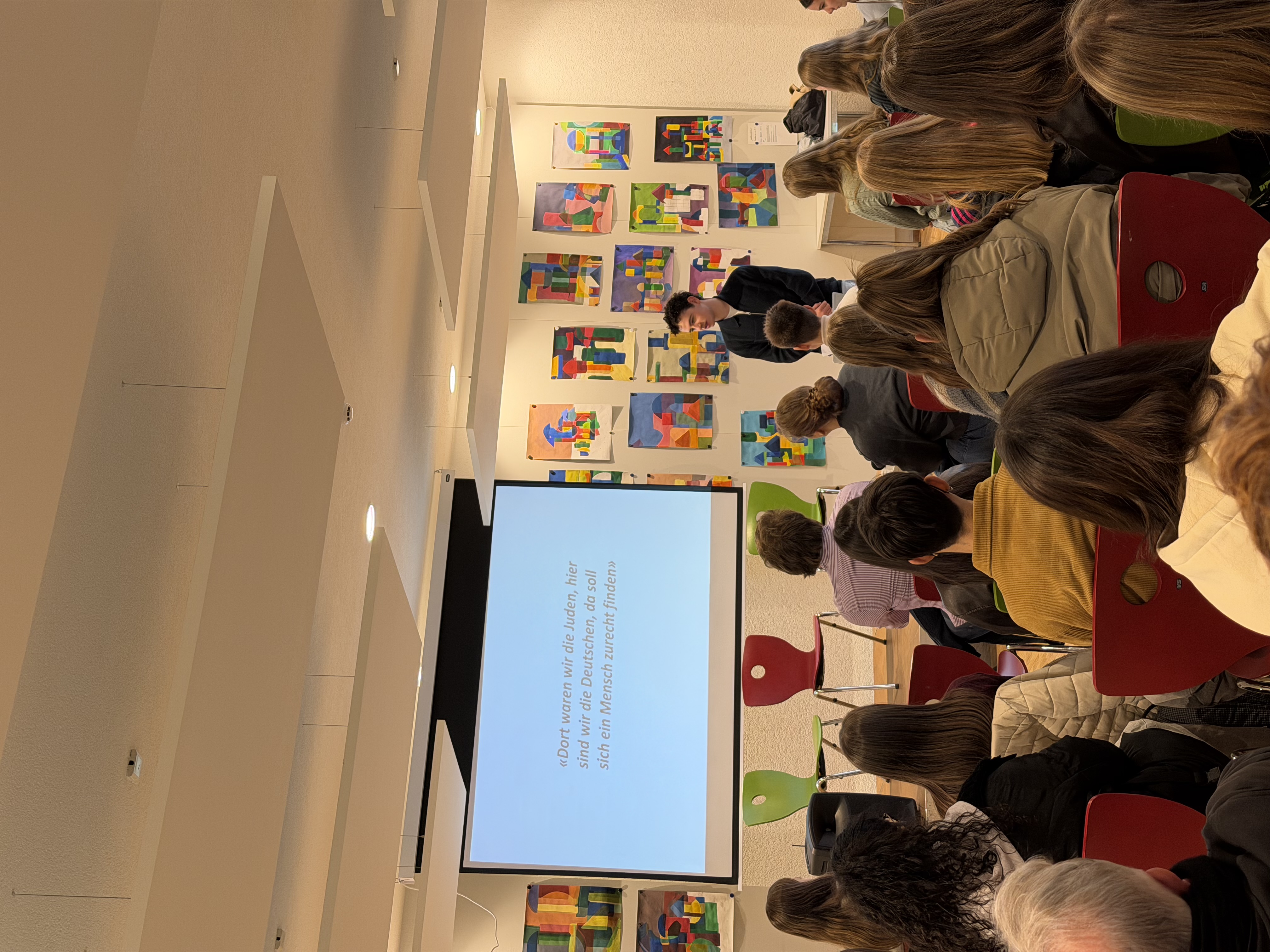 Die Veranstaltung wurde mit einem kurzen Grußwort unseres Schulleiters Herrn Braun eröffnet. Anschließend folgte ein besonderes Highlight: Adam Klein aus Zürich war extra aus der Schweiz angereist und erzählte von seiner eigenen Familiengeschichte. Dabei ging es auch um die jüdische Geschichte seiner Familie – mit Verbindungen bis nach Stuttgart. Sein Vortrag war sehr persönlich und hat viele im Publikum spürbar berührt.