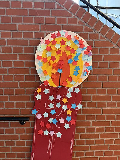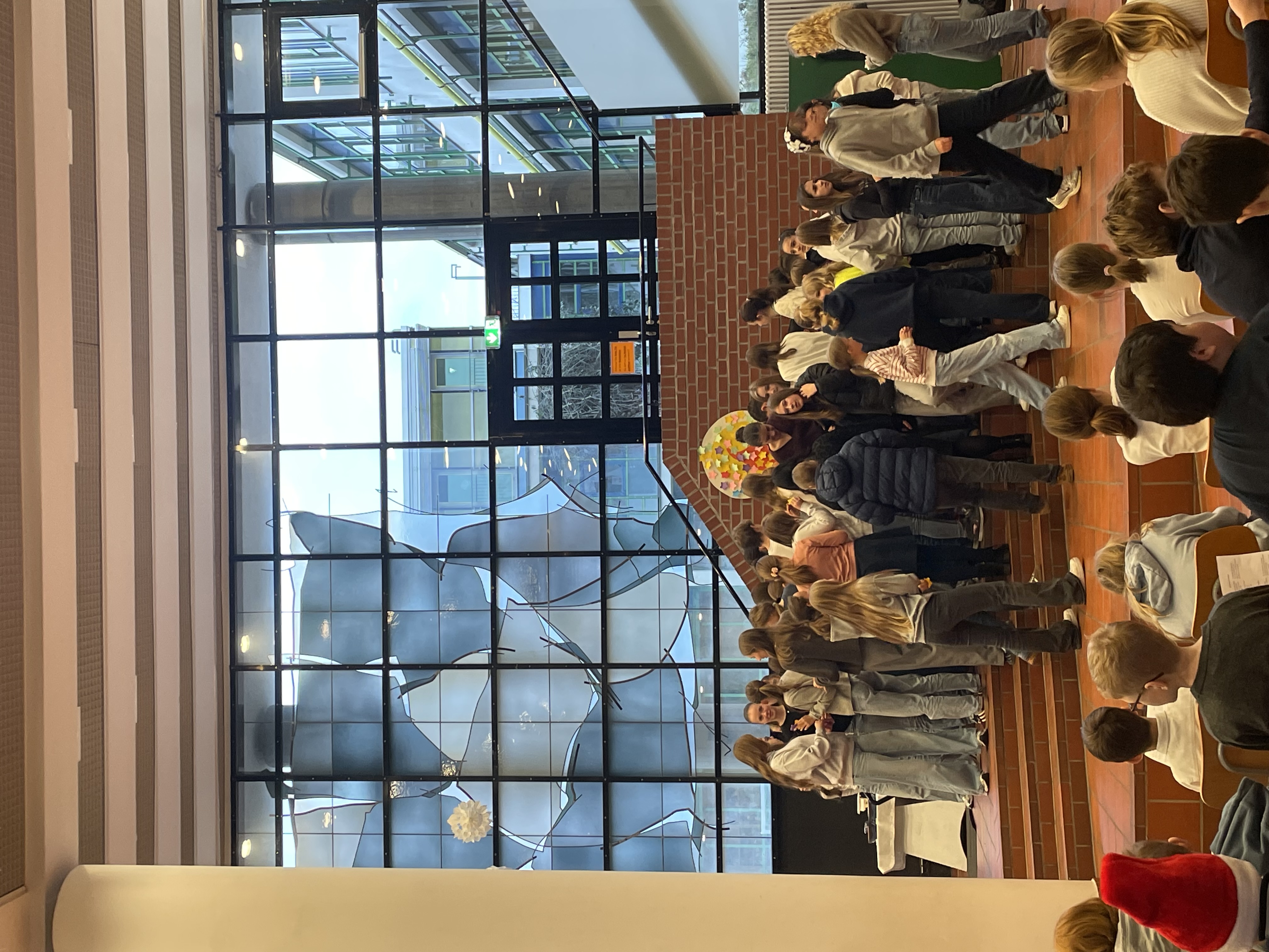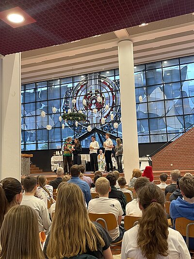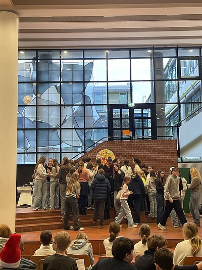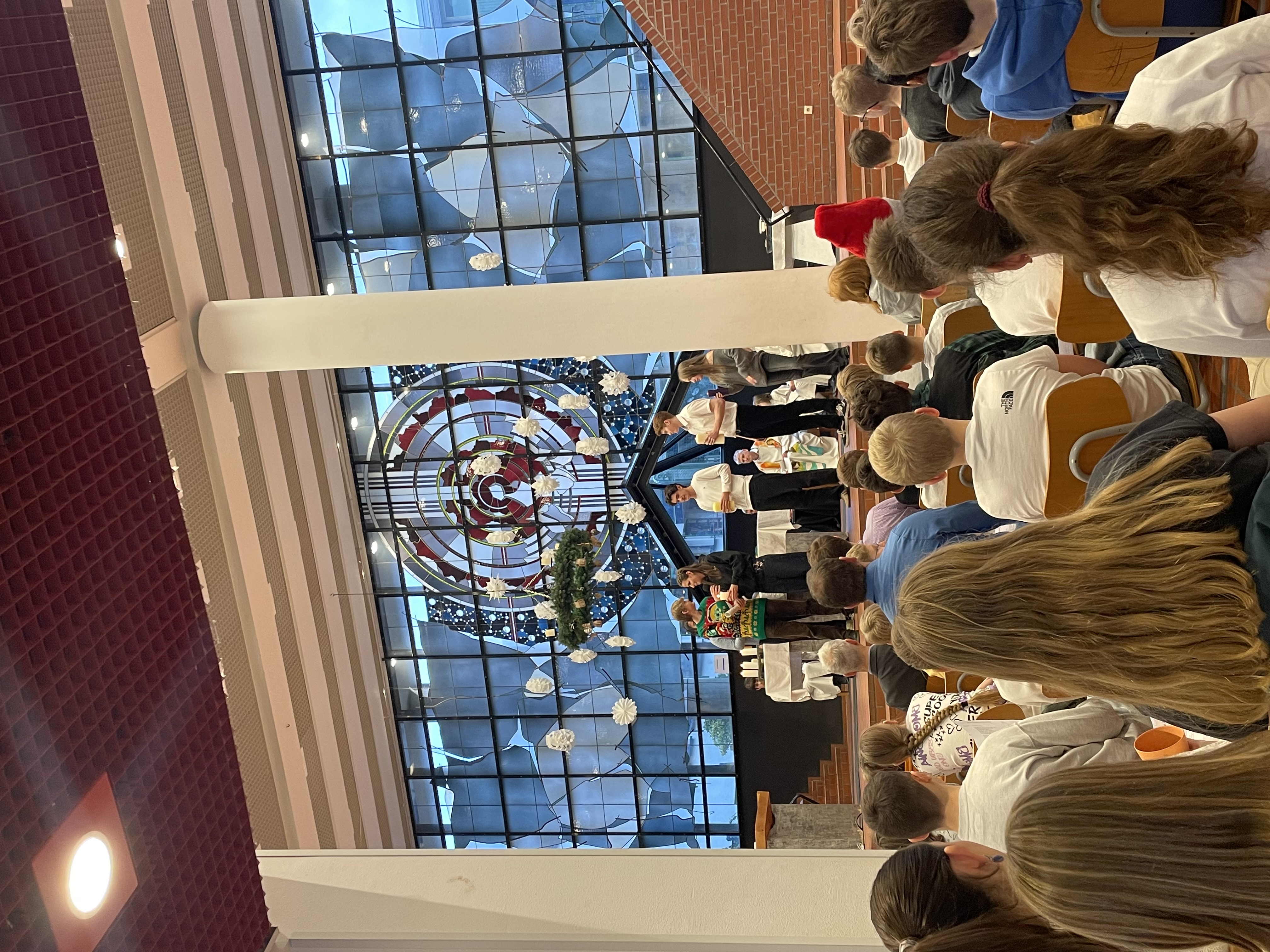 Am Freitag fand in unserer festlich geschmückten Aula der Weihnachtsgottesdienst statt. Große Schneeflocken und leuchtende Kerzen schufen eine besondere Atmosphäre und machten das zentrale Thema des Gottesdienstes sichtbar: Licht in dunklen Zeiten. Im Mittelpunkt stand ein Anspiel, das sich an den Kerzen des Adventskranzes orientierte. Vertrauen, Freude und Frieden wurden dabei kritisch hinterfragt – Erfahrungen aus der Lebenswelt der Schülerinnen und Schüler wurden aufgegriffen und mit aktuellen Herausforderungen in Verbindung gebracht. Am Ende blieb die Hoffnung als Licht, das nicht erlischt und dazu ermutigt, nicht aufzugeben und die Welt ein klein wenig besser zu machen.